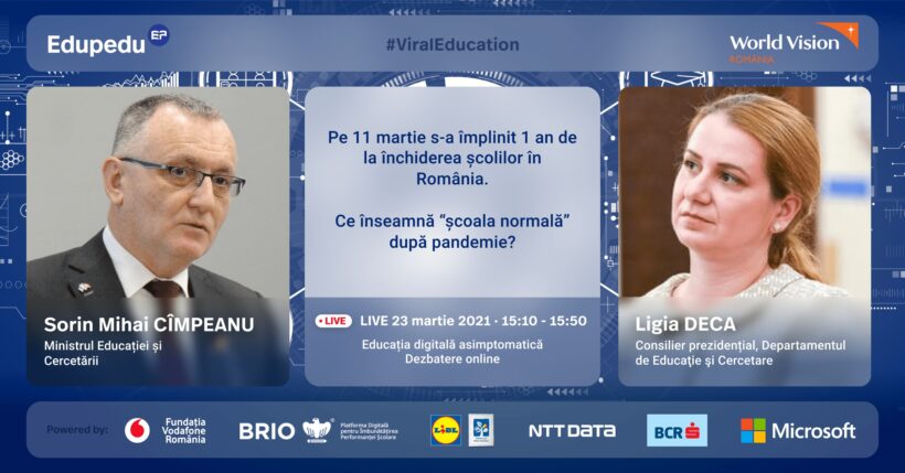 Școala românească va ieși din marea criză pandemică cu un upgrade pentru copii sau reculul va fi atât de puternic, încât tehnologia va fi complet abandonată? Ce rămâne din școala online și cea digitală, când toate clasele se vor deschide? Despre noutățile pe care digitalizarea le va aduce școlii, după pandemie, vor discuta pe larg marți, de la 15:00, ministrul Educației, Sorin Cîmpeanu, și consilierul prezidențial Ligia Deca, în cadrul celei mai importante dezbateri privind viitorul educației digitale, organizate de Edupedu.ro și World Vision România.